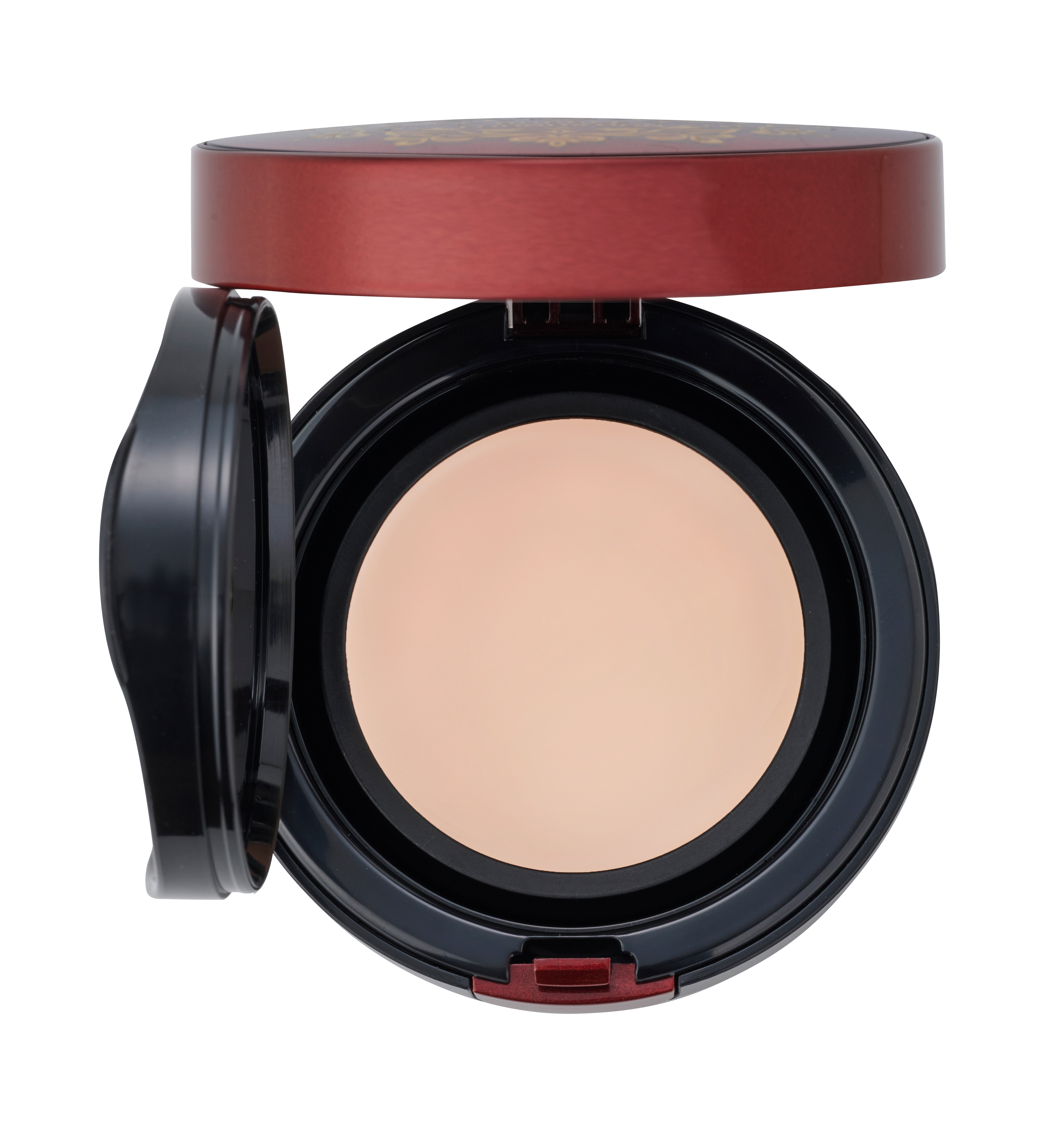 内蓋を開ける際はコンパクトのフチを下から包み込むように持ち(蝶番の部分は押さえないようにしてください)、親指と人差し指で内蓋の右側のつまみをしっかり持ち、引き上げるように開けます。